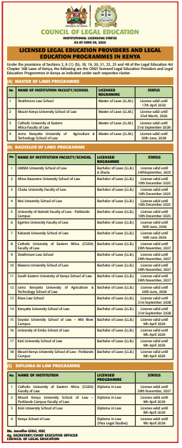 The government, through the Council of Legal Education (CLE), has released an official list of institutions authorized to offer legal education in Kenya as of June 2025.