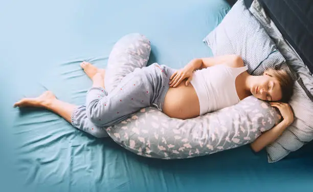 Sleeping on your left side is often recommended during pregnancy as it improves blood flow to the baby and reduces pressure on internal organs. Place the pillow along your body so that it supports your head, belly, and knees while you lie on your side.