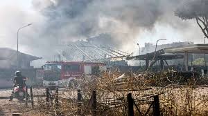 Firefighters wrote on X that the fire was still burning but was under control. Flames spread to a nearby depot, while the shockwave from the explosion damaged nearby buildings, breaking windows.
