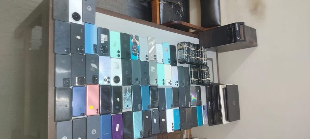 A search inside the premises uncovered a large cache of electronic devices suspected to be stolen. Officers recovered 65 mobile phones in working condition, seven laptops and 52 dismantled assorted mobile phones, indicating that the gadgets were either being resold or stripped for spare parts.