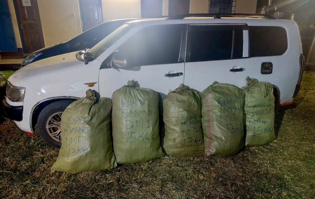 Officers from the National Police Service in Teso South intercepted a Toyota Probox vehicle at the market on Thursday. A search of the car uncovered five sacks of bhang weighing 69 kilograms, with an estimated street value of Sh 2,070,000. One suspect was arrested and is in police custody, awaiting court arraignment. The vehicle and the seized drugs have been secured.
