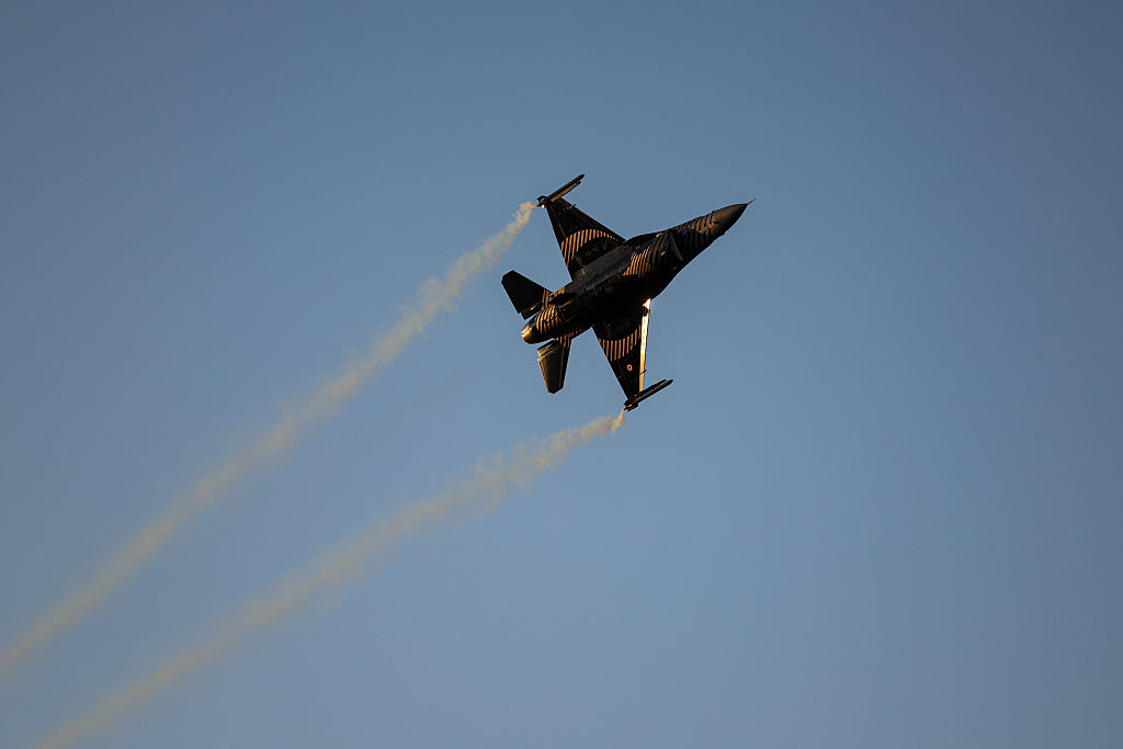 ANKARA, TURKIYE- AUGUST 30: Turkey’s SoloTürk F-16 demonstration team perform an air show over Anıtkabir in Ankara during Victory Day celebrations on August 30, 2025 in Ankara, Türkiye. (Photo by Ugur Yildirim /dia images via Getty Images)
